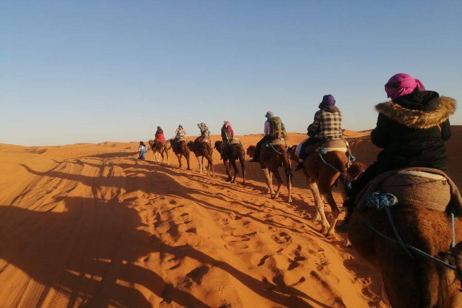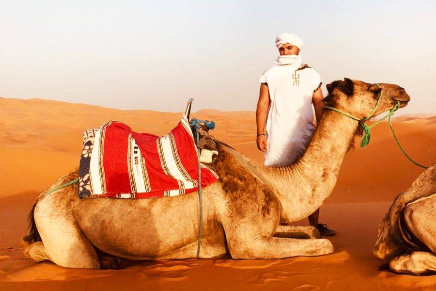 Ankunft in Merzouga Dunne Erg Chebbi Genießen Sie den Kamelritt, um die Wüste mit einer wunderschönen Sonnenuntergangslandschaft zu erreichen, um die Mitarbeiter des Wüstencamps zu treffen und die Nacht in der Wüste mit Instrumenten sahrawischer Musik zu verbringen.
