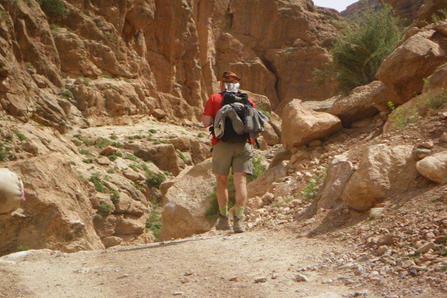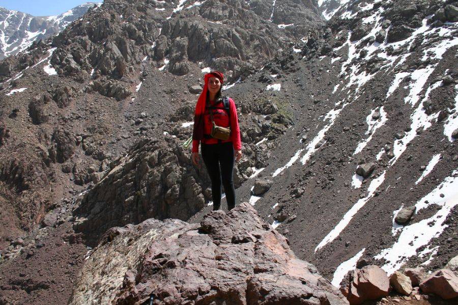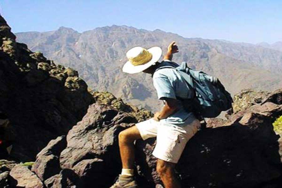 Der Weg führt zunächst steil bergauf durch felsiges Gelände, ist aber gut zu bewältigen. Während des Aufstiegs erleben Sie die atemberaubende Schönheit des Atlasgebirges und der umliegenden Landschaft. Atmen Sie ruhig und gleichmäßig, während die Vorfreude mit jedem Schritt zum Gipfel steigt.
