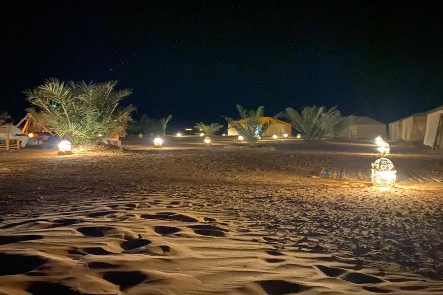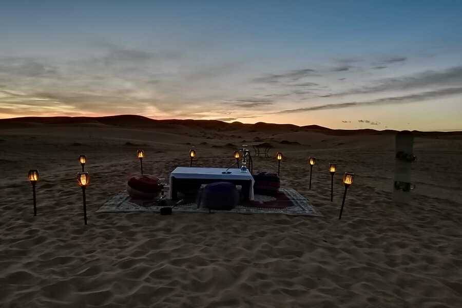 Nach einiger Zeit, um die Sanddünen und die umliegende Landschaft zu bewundern, machen Sie sich bereit für ein marokkanisches Abendessen, das unter den Sternen am Lagerfeuer serviert wird. Spät in der Nacht werden Sie Ihre lokalen Nomadenwirte mit ihrer lokalen Musik und Trommeln unterhalten.