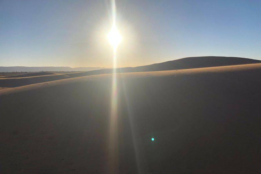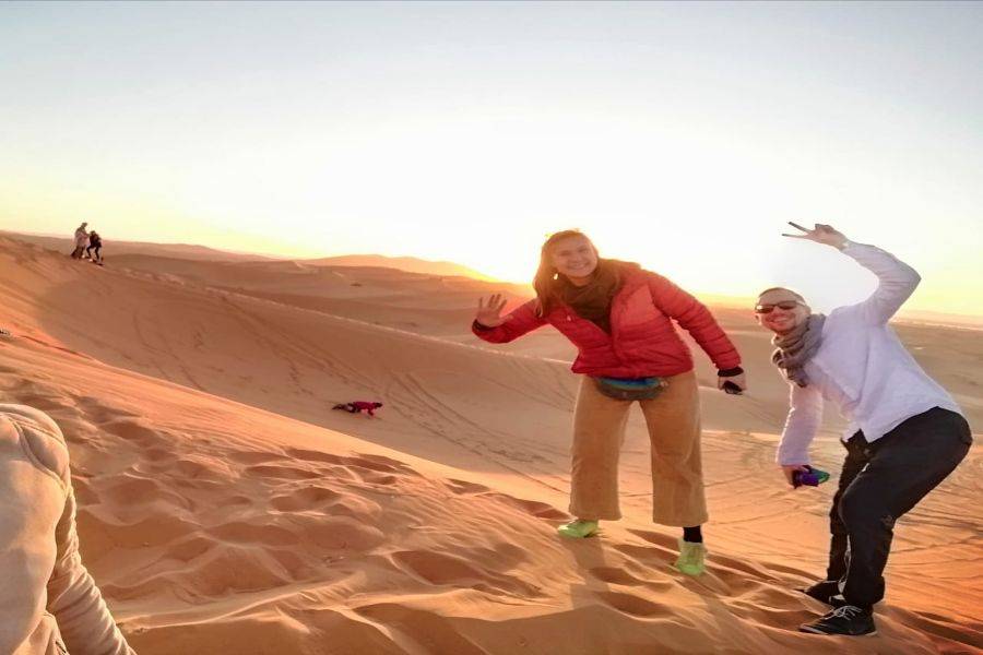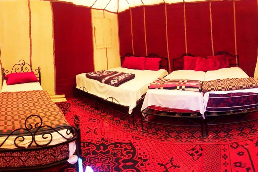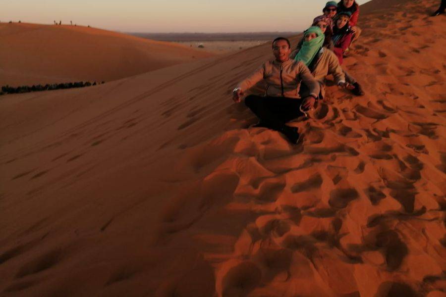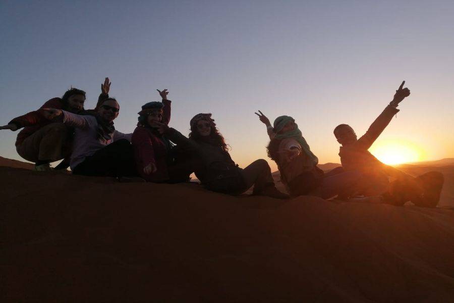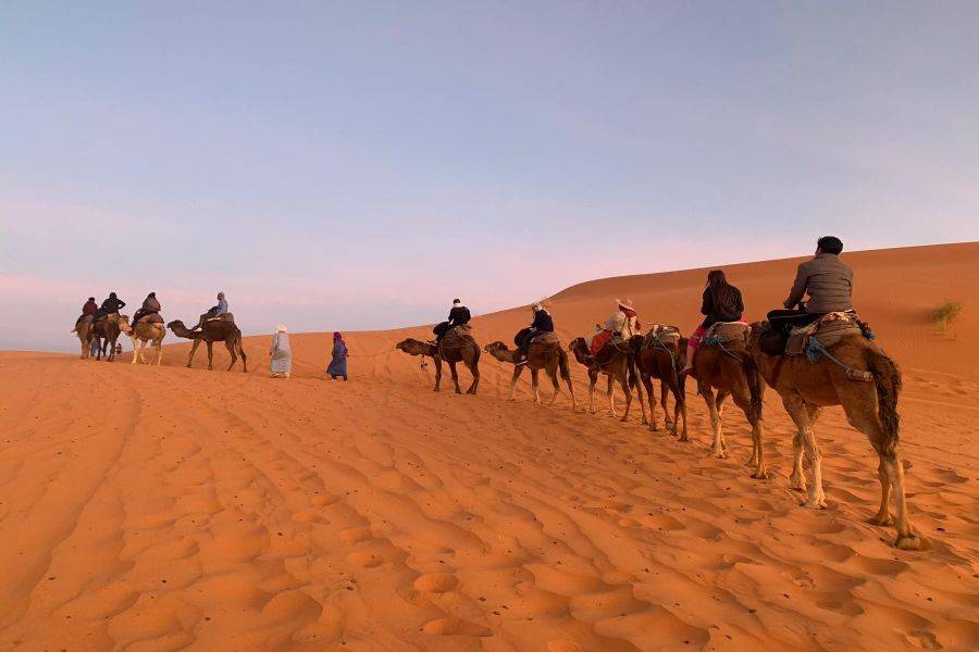 Ankunft in Merzouga Dunne Erg Chebbi Genießen Sie den Kamelritt, um die Wüste mit einer wunderschönen Sonnenuntergangslandschaft zu erreichen, um die Mitarbeiter des Wüstencamps zu treffen und die Nacht in der Wüste mit Instrumenten sahrawischer Musik zu verbringen.