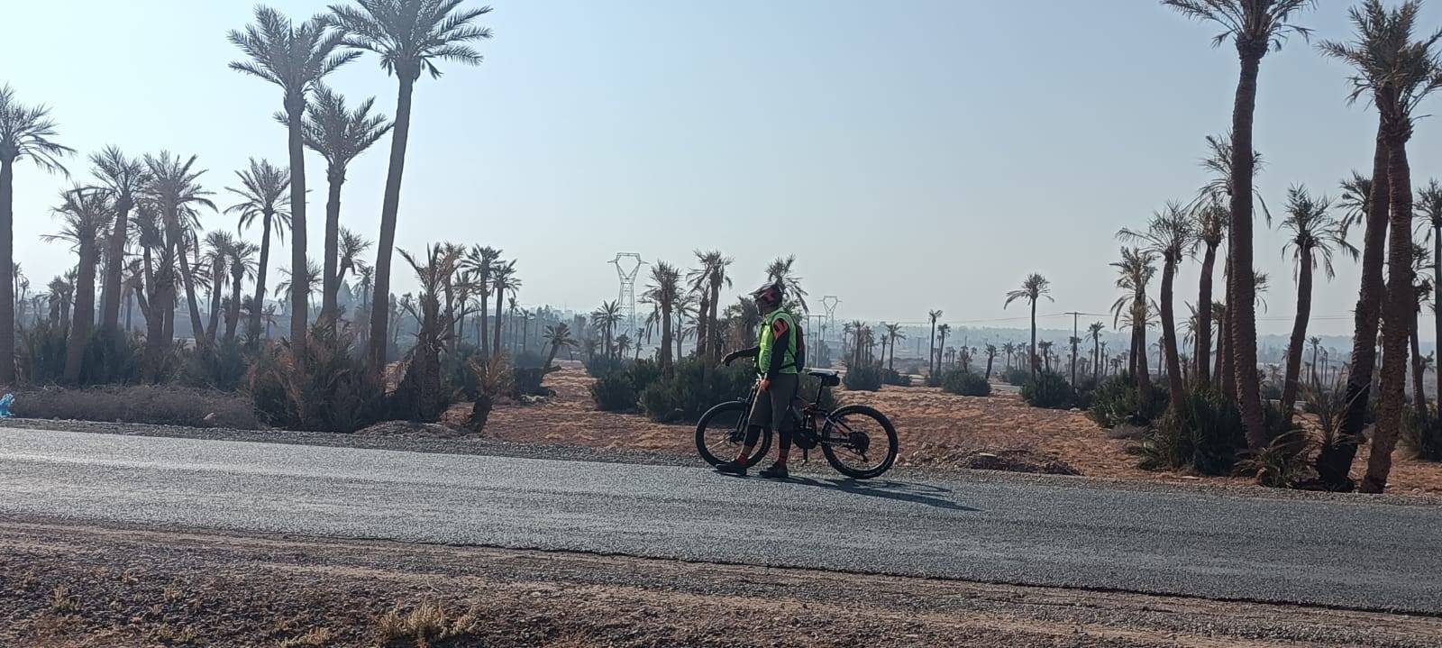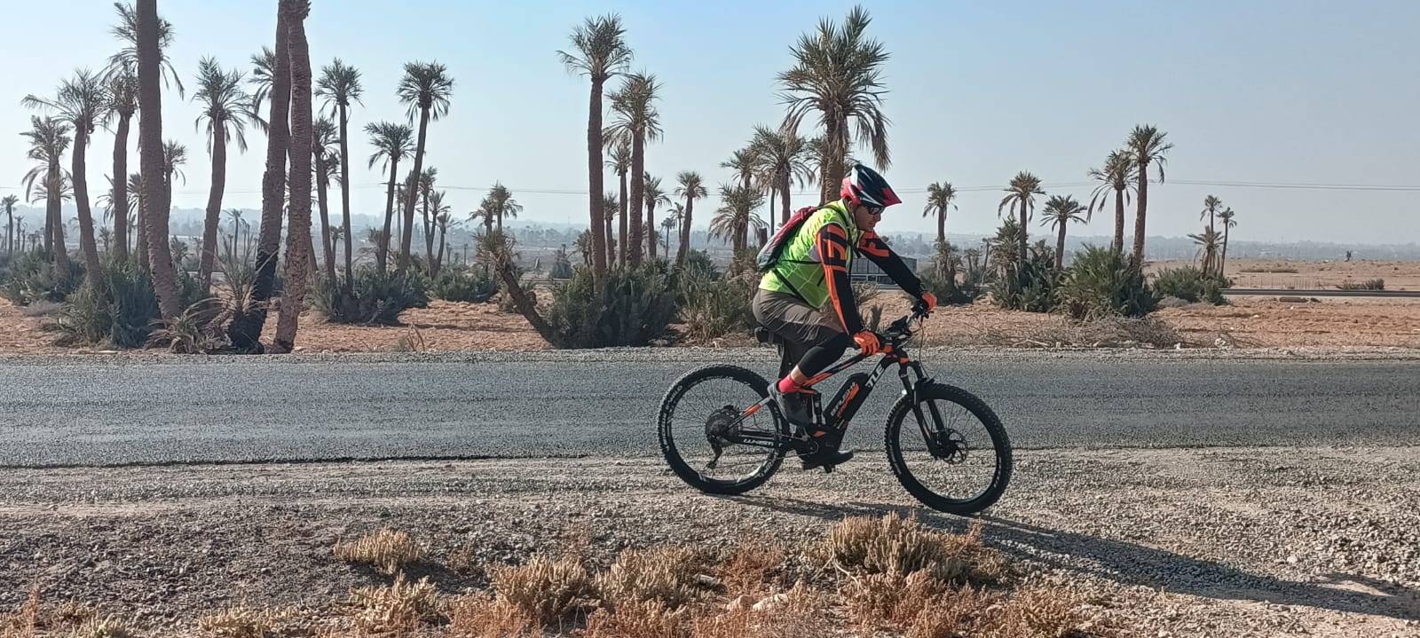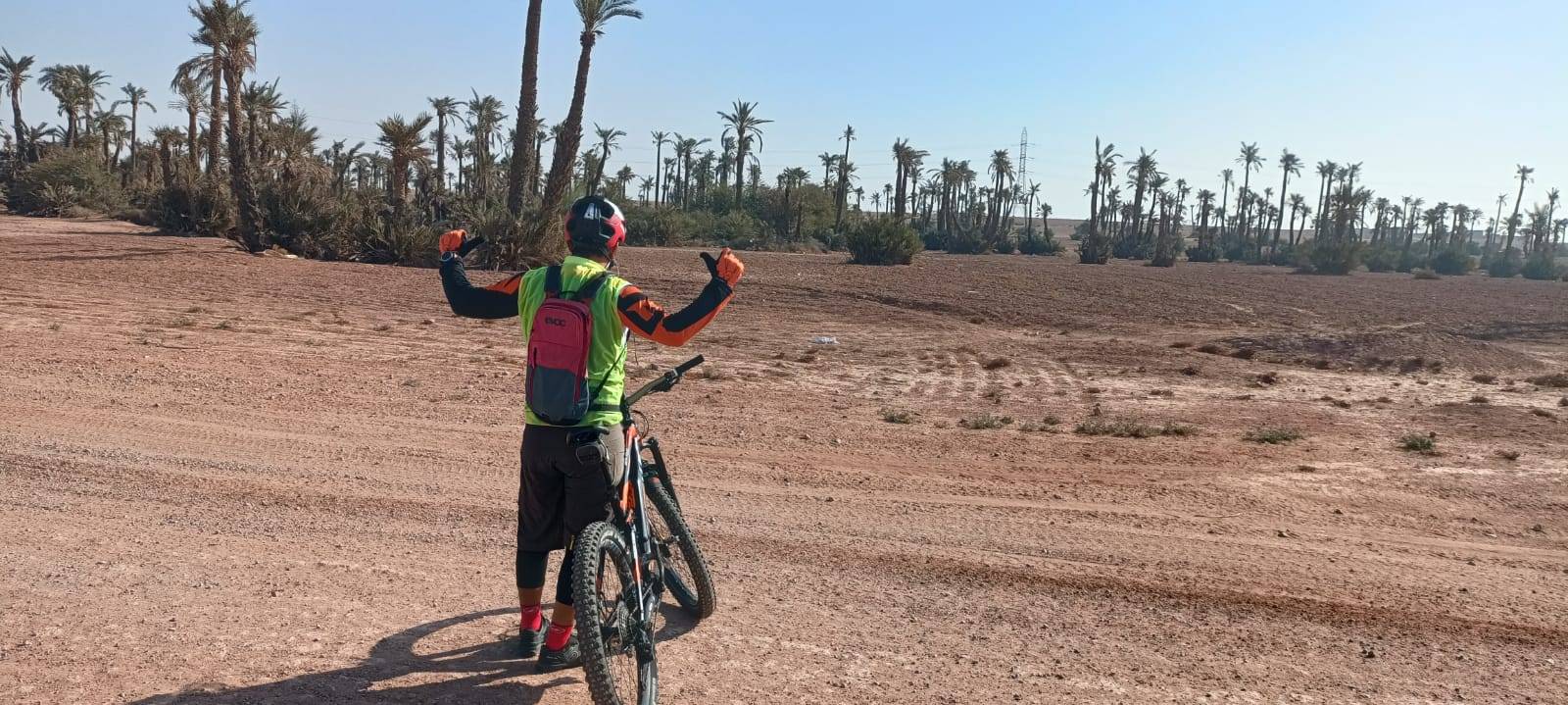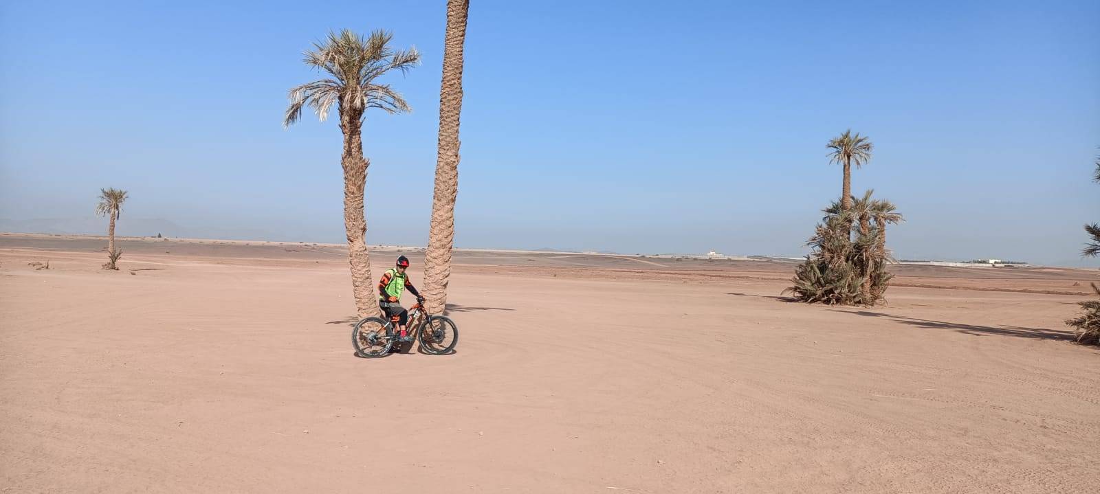 Radtour in der Palmeraie (Palmenhain), einer Palmenoase mit mehreren hunderttausend Palmen außerhalb von Marrakesch, am Rande des nördlichen Teils der Stadt auf einer Höhe von 580 m über dem Meeresspiegel gelegen, misst sie 8,0 km Länge und Mit einer Fläche von 140 km2 ist dieser Teil von Marrakesch als eines der beliebtesten Reiseziele in Marrakesch für Motorsport-Enthusiasten wie ATVs 4/4 oder zum Kamelreiten oder sogar zum Ballonfahren bekannt.