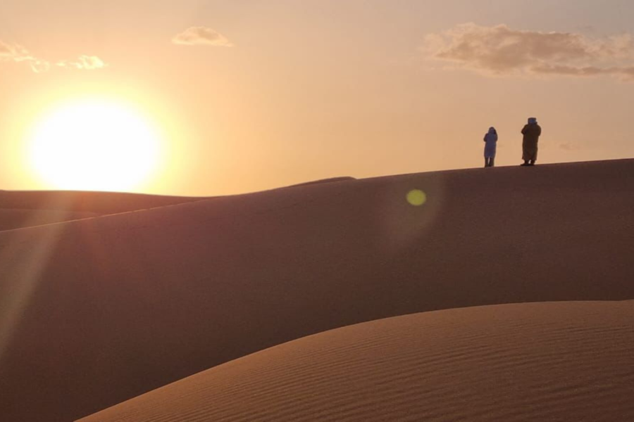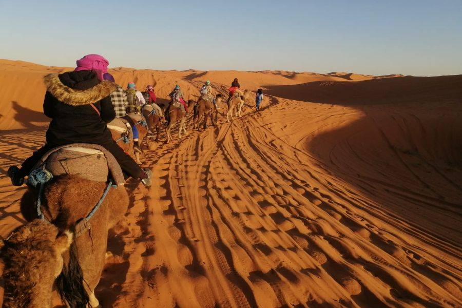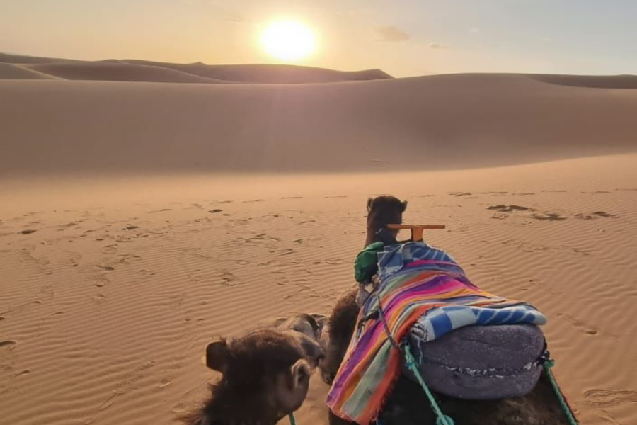 Nach dem Frühstück in Ihrem Hotel verlassen Sie Tinghir in Richtung Dades Gorge, entdecken den Naturort mit seinen erstaunlichen hohen Schluchten und genießen die Ruhe des Ortes, während Sie sich zwischen zwei Schluchten befinden. Sehen Sie Berberdörfer, die auf dem Weg verstreut sind, und fahren Sie durch Tinjdad, Jorf und Erfoud, um ein Gefühl für die Sahara-Landschaft zu bekommen. Besuchen Sie die Oase Tafilalet vor Ihrer Ankunft in Merzouga. Machen Sie eine kurze Pause, um sich in Merzouga zu entspannen, bevor Sie auf den Rücken eines Kamels klettern und die Sanddünen auf dem Weg zu einem nomadischen Berbercamp überqueren. Sehen Sie die Sanddünen und die Wüstenlandschaft aus einer zeitlosen Perspektive, während Sie den Trommeln des Wüstenlagers mitten in der Sahara lauschen. Machen Sie Fotos vom dramatischen Sonnenuntergang von der Spitze einer hohen Düne. Dann gehe ins Lager, um die Nacht in einem Nomadenzelt zu verbringen.