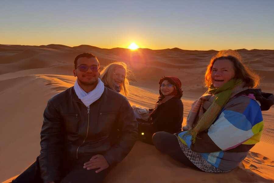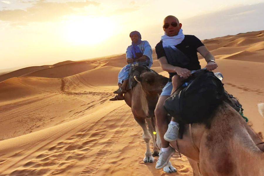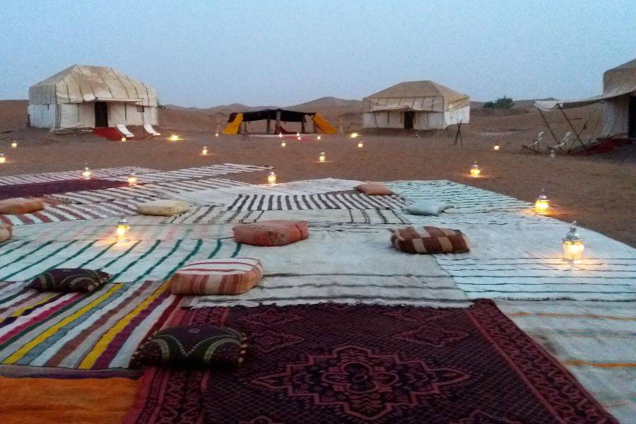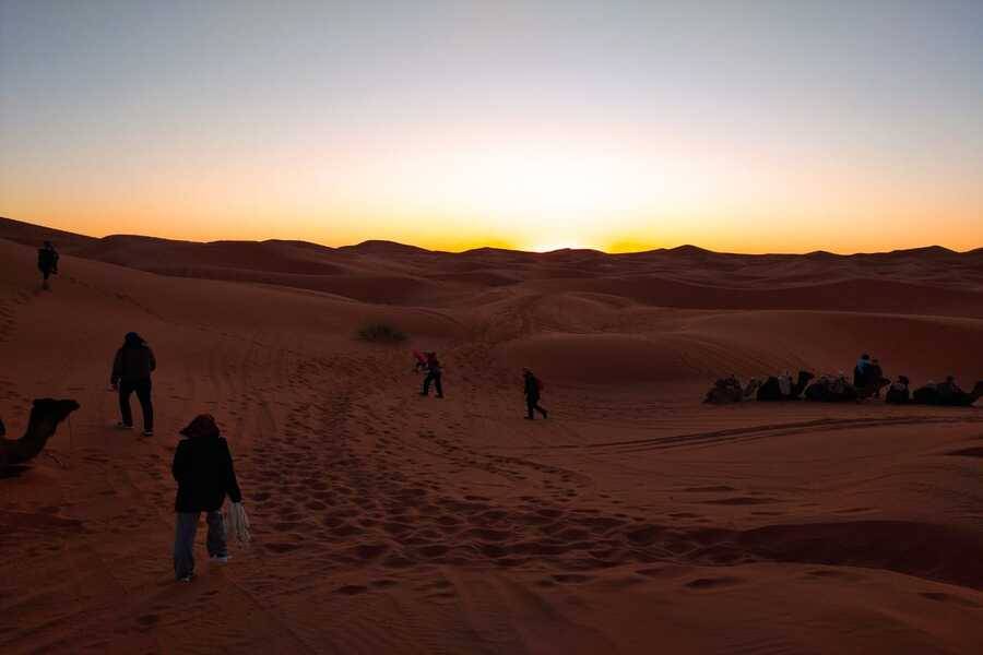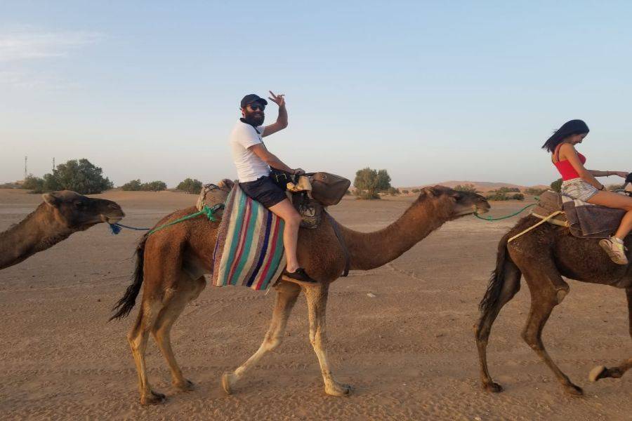 In Merzouga angekommen, werden wir Kamele tauschen, um in die Wüste einzutauchen und uns auf den Weg zum Beduinenlager zu machen, wo wir die Nacht verbringen und ein traditionelles marokkanisches Abendessen genießen werden.